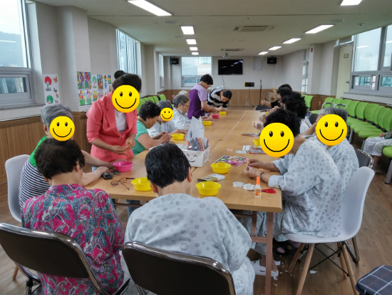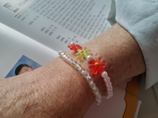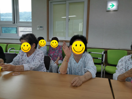 편마비가 있는 어르신 팔찌를 만들어 드리기 위해 열심히 핑크빛