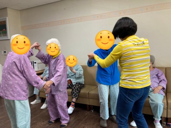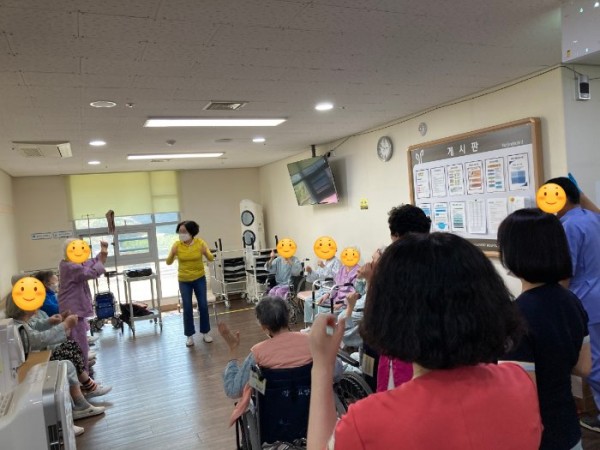 여가 프로그램 건강체조 진행으로 병동 분위기가 신났어요. 매주 화요일 병동별로 환우를 대상으로 전문강사와 함께 건강체조를 진행하고 있어요. 건강체조 도입 부분에 틀어 놓은 트로트에 병동 분위기는 무도회 장이 돼버렸어요. 반복되는 동작을 잘 따라 하시거나 노래를 부르며 호응해 주시는 것을 볼 수 있었으며 손과 발을 이용하여 신쳬활동을 함으로써 신체기능 유지에 도움이 되는 건강체조 전문 강사님 진행으로 더욱 즐거웠던 것 같아요.